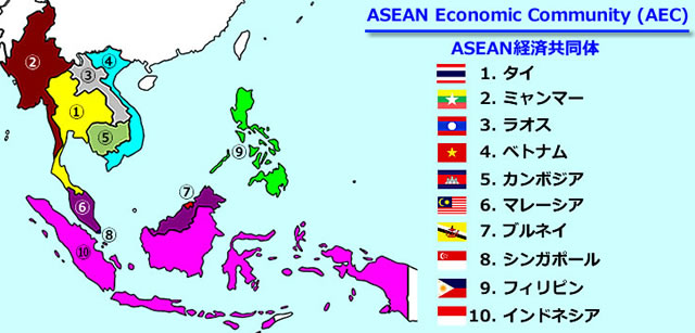 2015年12月31日、EUを上回る人口6億人超の巨大経済圏「ASEAN経済共同体(AEC)」がついに発足しました。加盟10ヶ国の間では、関税の撤廃や税関手続きの簡素化、観光ビザの廃止、熟練労働者の自由な移動、外資出資規制の緩和など、ヒト・モノ・カネの自由化が進行しており、経済活動の活性化に繋がると期待されています。